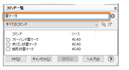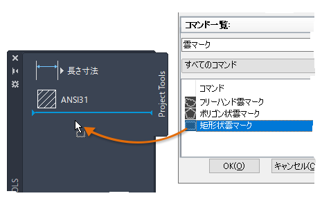 3. [コマンド一覧]で、[矩形状雲マーク]コマンドをツール パレットにドラッグします。