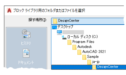 - [DesignCenter]フォルダに移動します。このフォルダには、各種のサンプル図面が格納されています。