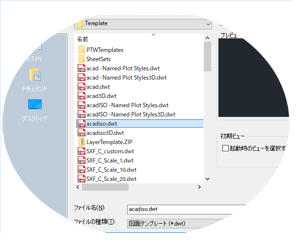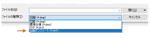 単独で作業している場合は、自分の好みに合った独自の図面テンプレート ファイルを作成し、慣れてきたら徐々に他の機能の設定を追加することができます。既存の図面テンプレート ファイルを修正するには、[開く]をクリックして、[ファイルを選択]ダイアログ ボックスで[図面テンプレート(*.dwt)]を選択し、図面テンプレート ファイルを選択します。