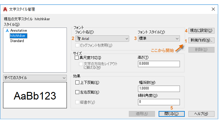 新しい文字スタイルを作成するには、次に示すように、[文字スタイル管理]コントロールをクリックします。