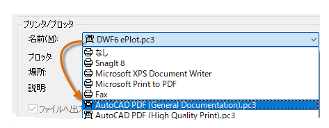 [プリンタ/プロッタ]ドロップダウン リストから、 [AutoCAD PDF (General Documentation).pc3] を選択します。