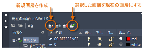 新しい画層を作成するには、下図の[新規画層を作成]ボタンをクリックし、新しい画層の名前を入力します。別の画層を現在の画層にするには、画層をクリックし、次に[現在に設定]ボタンをクリックします。