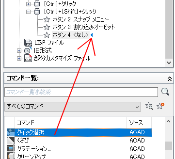 マウス ボタンに追加するコマンドを、[コマンド一覧]ペインから[