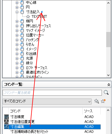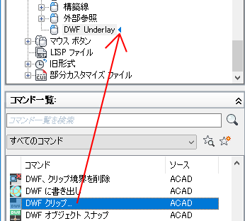 - ダブルクリック アクションに追加するコマンドを、[コマンド一覧]ペインから[ <ファイル名> 内のカスタマイズ]ペインにドラッグします。