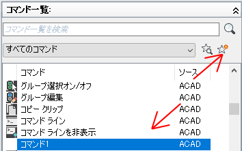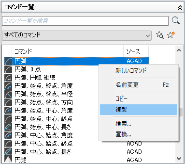 - [カスタマイズ]タブの[コマンド一覧]ペインで、複製を作成するコマンドを探します。