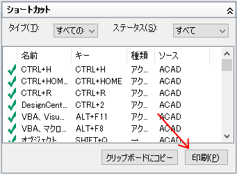 2. [ショートカット]ペインで、印刷するキーボード ショートカットのタイプとステータスをフィルタします。