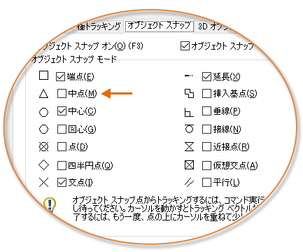 「定常オブジェクト スナップ」と呼ばれる既定のオブジェクト スナップを設定するには、OSNAP[オブジェクト スナップ設定]コマンドを使用します。たとえば、[中点]オブジェクト スナップを既定でオンにしておくと便利な場合があります。