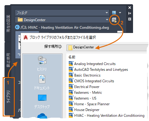 - DesignCenter フォルダから他のライブラリ図面を選択するには、[ライブラリ]タブが現在のライブラリであることを確認し(1)、ファイル ナビゲーション ボタン(2)をクリックします。