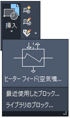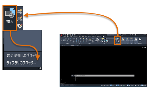 - [ホーム]タブの[挿入]をクリックし、[ライブラリのブロック]をクリックします。これによって、BLOCKSPALETTE[ブロック パレット]コマンドが起動されます。