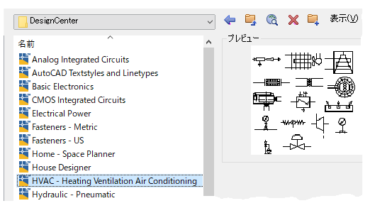- [DesignCenter]フォルダに移動します。このフォルダには、各種のサンプル図面が格納されています。