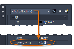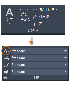 他のいくつかの注釈機能と同じように、マルチ テキストにも多数の設定が用意されています。このような設定は、STYLE[文字スタイル管理]コマンドを使用して「文字スタイル」 として保存できます。その後、[注釈]パネルのドロップダウン矢印をクリックして保存した文字スタイルにアクセスすることができます。現在の文字スタイルが、ドロップ ダウン リストの一番上に表示されます。