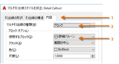 たとえば、「バルーン」を作成するには、MLEADERSTYLE[マルチ引出線スタイル管理]コマンドを開始します。[マルチ引出線スタイル管理]ダイアログ ボックスで[新規作成]をクリックし、新しいマルチ引出線スタイルの名前を決めます。[コンテンツ]タブをクリックし、[ブロック]を選択し、次に示すように[詳細バルーン]を選択します。