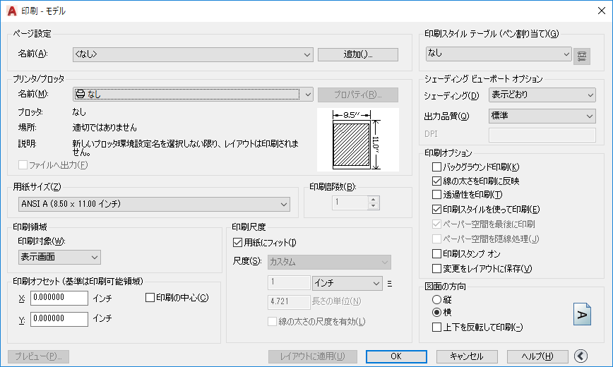 印刷の設定作業が簡単になるように、このような設定の集まりを保存し、名前で呼び出すことができます。これを「ページ設定」と呼んでいます。 ページ設定を使用することで、異なるプリンタでの印刷、グレースケールでの印刷、図面からの PDF ファイルの作成などに必要な設定を格納することができます。