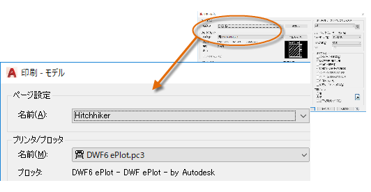 印刷する場合、[印刷]ダイアログ ボックスでページ設定の名前を指定するだけで、その印刷設定のすべてが呼び出されます。次の図では、[印刷]ダイアログ ボックスは、プロッタではなく DWF (Design Web Format)ファイルへの出力用である[Hitchhiker]ページ設定を使用するように設定されています。