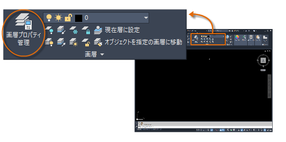 図面の編成方法を確認するには、LAYER[画層管理]コマンドを使用して、[画層プロパティ管理]を開きます。コマンド ウィンドウで LAYER または LA と入力したり、リボンの[画層プロパティ管理]ツールをクリックして表示します。