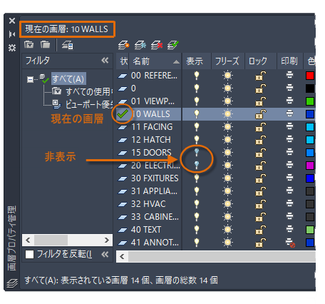 次に示すのは、[画層プロパティ管理]の最も一般的に使用される画層の設定です。設定のオン/オフを切り替えるには、アイコンをクリックします。