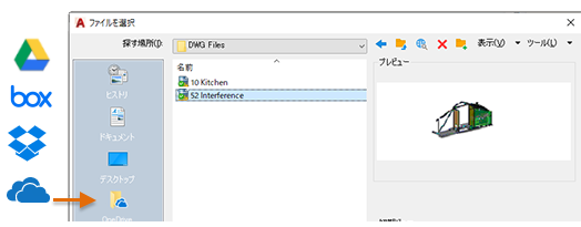 クラウド ストレージ プロバイダのアカウントを持っている場合は、そのアカウントを AutoCAD のファイル選択ダイアログ ボックスの場所バーに追加して、クラウド ストレージ アカウントの図面に直接アクセスすることができます。場所バー内で右クリックし、ナビゲーション ショートカットの名前とパスを入力するだけです。