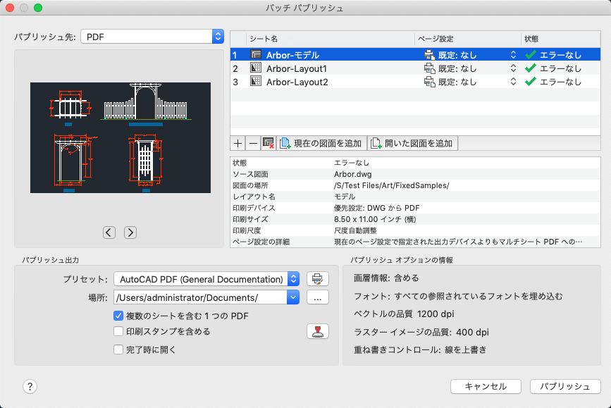 図面セットを PDF ファイルにパブリッシュしたり、ハード コピー出力用にページ設定で指定されているプリンタに送信することができます。