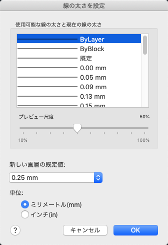 Controls the DEFAULT lineweight for layers. The initial DEFAULT lineweight is 0.01 inches or 0.25 mm. (LWDEFAULT system variable)