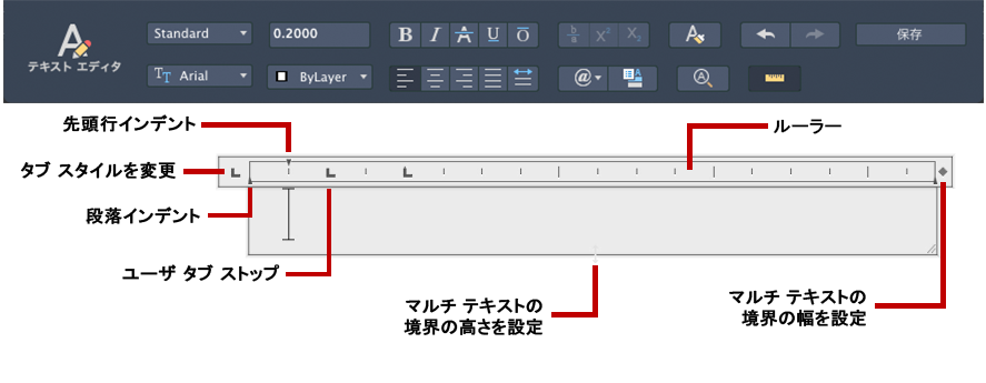 マルチ テキストで使用する文字を他のファイルから読み込むまたは貼り付けたり、タブを設定したり、段落や行の間隔と位置合わせを調節したり、段組みを作成、修正できます。