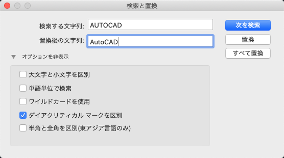 文字列内のすべての文字の大文字/小文字が、[検索する文字列]と一致する必要があります。このチェック ボックスをオフにすると、文字の大文字と小文字には関係なく、指定した文字列とマッチするものが検索されます。
