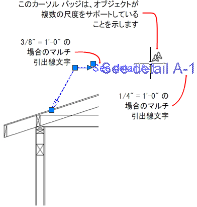 次の図に、2 つの異なるオブジェクト尺度が割り当てられているマルチ引出線を示します。