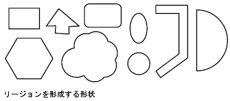 リージョンは、閉じた「ループ」を形成するオブジェクトから作成できます。 ループは、領域を閉じる線分、ポリライン、円、円弧、楕円、楕円弧、スプラインを組み合わせて構成できます。