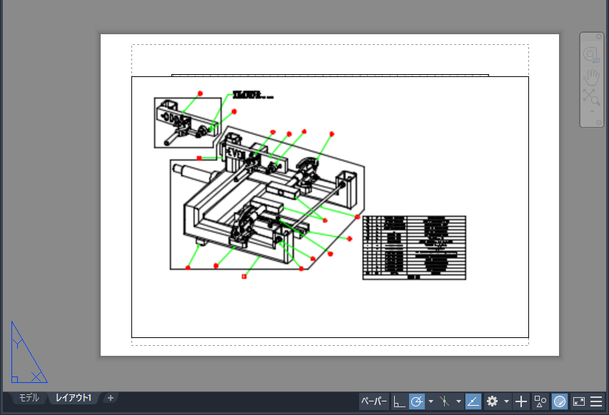 - 印刷用に図面を準備するには、ペーパー空間に切り替えます。ここでは、タイトル ブロックや注記を使用して異なるレイアウトを設定できます。また、各レイアウトには、モデル空間の異なるビューを表示するレイアウト ビューポートを作成できます。レイアウト ビューポートで、ペーパー空間を基準としてモデル空間ビューの尺度を設定します。ペーパー空間の単位は、用紙の上での実際の距離(ページ設定に応じてミリメートルまたはインチ)を表します。