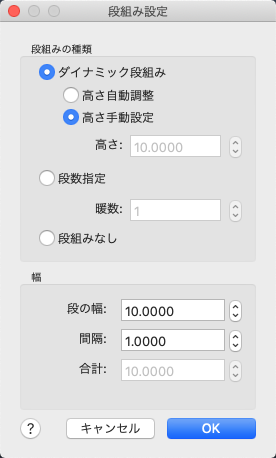 種類、段数、高さ、幅、間隔サイズのような段組みを設定するためのオプションが表示されます。