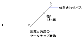 PolarSnap™ を使用すると、極位置合わせパスに沿って指定した距離にスナップできます。たとえば、次の図では、点 1 から点 2 まで 2 単位の線分を描きます。次に、その線分と 45 度の角度をなす点 3 に向かって 2 単位の線分を描きます。極角度の増分を 45 度に設定すると、カーソルが 0 度または 45 度の角度と交わるときに位置合わせパスとツールチップが表示されます。カーソルをその角度から離すと、位置合わせパスとツールチップが消えます。