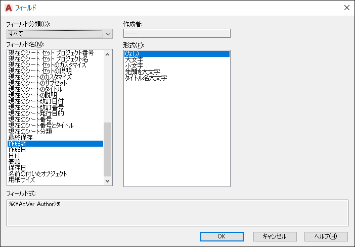 この項目のラベルは、フィールド名によって異なります。たとえば、[フィールド名]リストから[ファイル名]を選択すると、ラベルは「ファイル名」、値は現在の図面ファイルの名前になります。オブジェクト フィールドのラベルは「プロパティ」です。例外: 日付フィールドを選択した場合は、選択した日付の形式(たとえば M/d/yyyy)が表示されます。
