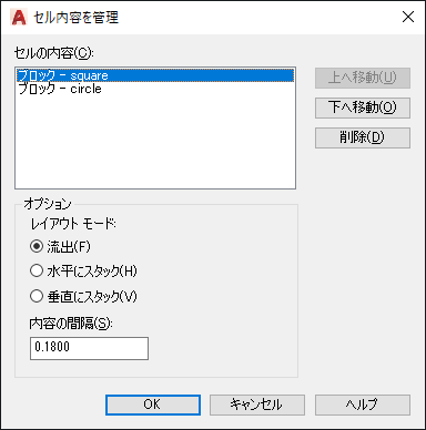 選択したセル内のすべての文字またはブロック、またはこの両方が、現れる順にリストされます。文字は、[表のセル文字列]ラベルで示されます。ブロックの場合、ブロック名の前に[ブロック]と表示されます。