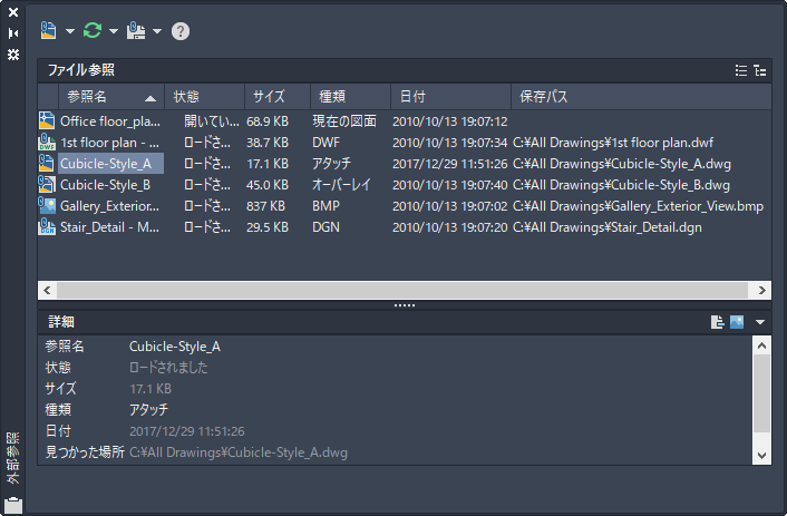 - 現在の図面内の参照一覧(ステータス、サイズ、作成日などの情報を含む)が表示されます。