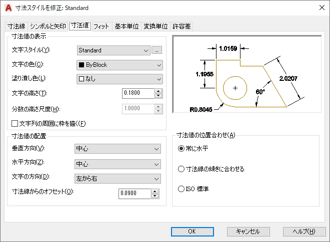 このタブで指定した文字スタイルの文字の高さが固定されている場合は、その高さがここで設定した文字の高さよりも優先されます。ここで寸法値の高さを設定する場合は、文字スタイルの高さが 0 (ゼロ)に設定されていることを確認してください。文字スタイルの文字の高さを設定する方法については、STYLE[文字スタイル管理]コマンドを参照してください。
