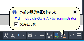 既定では、参照ファイルが変更されると、アプリケーション ウィンドウの右下コーナーに表示されている[外部参照]アイコンの近くにバルーン メッセージが表示されます。バルーンのリンクをクリックすると、変更されたすべての外部参照が再ロードされます。