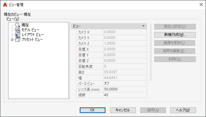 モデル ビューおよびレイアウト ビューに対して、名前の付いたビューに割り当てられているビューの種類が表示されます。