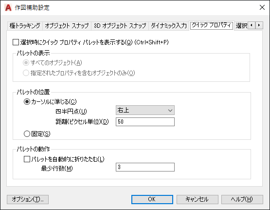 オブジェクトを選択したときに、選択したオブジェクトに従ってクイック プロパティ パレットを表示します。(システム変数 QPMODE)
