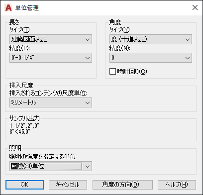 計測単位の形式には、建築図面表記、十進表記、工業図面表記、分数表記、指数表記があります。工業図面表記と建築図面表記の形式はフィートとインチで表示され、各作図単位は 1 インチを表すものとみなされます。他の形式は、実際の任意の単位で表すことができます。