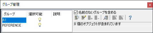 グループが選択可能かどうかを指定します。グループが選択可能であるとき、グループ内の 1 つのオブジェクトを選択するとグループ全体が選択されます。ロックされた画層やフリーズされた画層上のオブジェクトは選択されません。