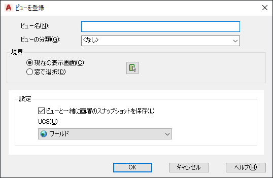 現在のビューポートの表示画面から、または矩形の窓を定義することにより、名前の付いたビューを新規登録します。