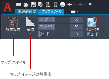 マップ イメージを選択すると、リボンに[マップ イメージ]コンテキスト タブが表示されます。このタブは、Autodesk Account にサイン インしているときにのみ表示されます。