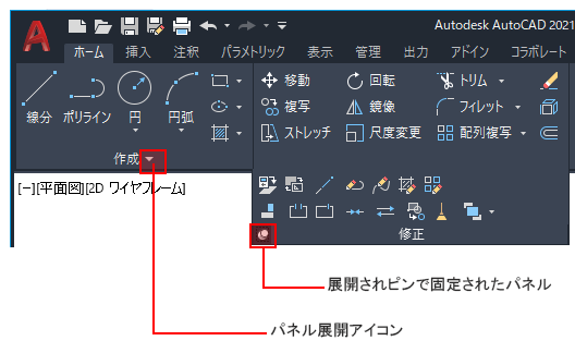 リボン タブからパネルを引き離し、作図領域や他のモニタに置くことができます。浮動パネルは、リボン タブを切り替えても、リボンに戻さない限り開いたままになります。