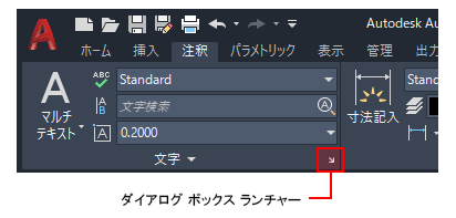 いくつかのリボン パネルからは、そのパネルに関連するダイアログ ボックスを表示できます。関連するダイアログ ボックスを表示するには、パネルの右下コーナーの矢印アイコン によって表されているダイアログ ボックス ランチャーをクリックします。