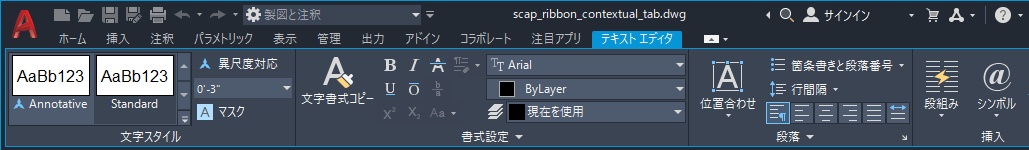 特定のタイプのオブジェクトを選択したり、特定のコマンドを実行すると、ツールバーやダイアログ ボックスではなく、コンテキスト リボン タブが表示されます。コンテキスト タブは、コマンドを終了すると閉じます。