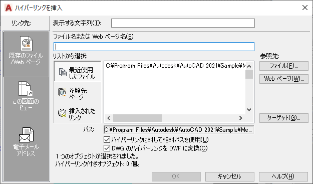 ハイパーリンクに関連付けたファイルへのパスが表示されます。[ハイパーリンクに対して相対パスを使用]チェック ボックスをオンにしているときは、ファイル名だけが表示されます。このチェック ボックスをオフにしているときは、絶対パスとファイル名が表示されます。