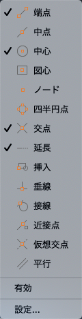 ステータス バーで[オブジェクト スナップ]を右クリックして、[設定]を選択します。