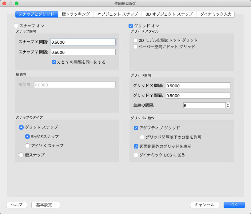 X 方向のグリッド間隔を指定します。この値を 0(ゼロ)にすると、グリッド間隔は[スナップ X 間隔]の値とみなされます。(システム変数 GRIDUNIT)