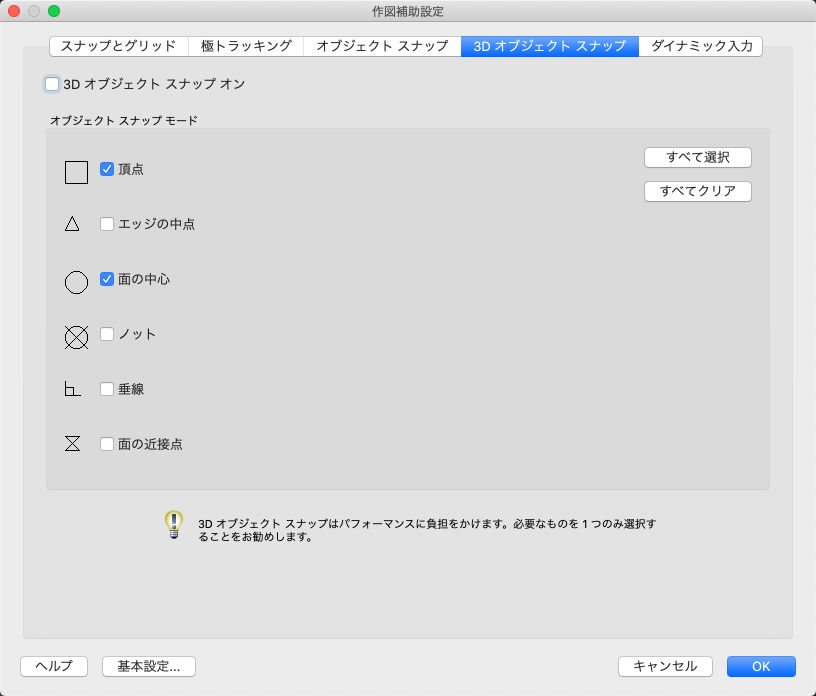 すべての 3D オブジェクト スナップ モードをオンにします。