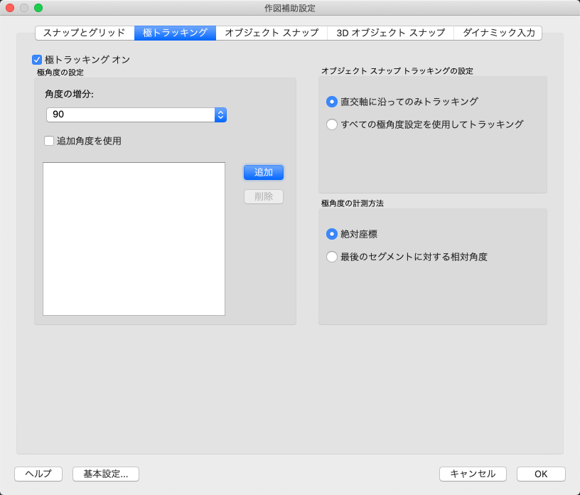 [追加角度を使用]をオンにすると、使用可能な追加角度が一覧表示されます。新しい角度を追加するには、[追加]をクリックします。既存の角度を削除するには、[削除]をクリックします。(システム変数 POLARADDANG)