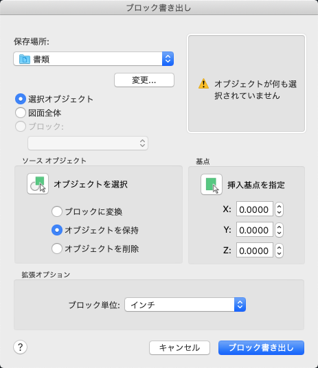 現在の図面で選択されたオブジェクト(1 つまたは複数)を、ファイルとして保存した後で現在の図面のブロックに変換します。